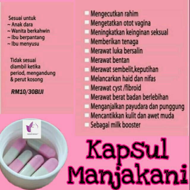 Tapi kalau yang jenis sapu tu, tak tahulah pulak saya macamana kan. *membersihkan rahim selepas haid *mengeluarkan angin dalam badan *memecahkan lemak di perut *mengurangkan masalah bau badan Wanita mengandung adalah ditegas dari melakukan rawatan ini. Nina sendiri menggunakan cosmoderm manjakani feminine wash tapi untuk eillya tetap dari cosmoderm tapi yang khas untuk remaja. Menghilangkan cradle cap pada kepala bayi. Membantu melambatkan proses penuaan, mencantikkan kulit; Ada juga yang jadikan ginseng, pueraria mirifica sebagai jamu. Kalau nak yang real, selepas di rebus cuci bahagian intim dengan air rebusan ( bila air tu dah suam la ye ).elok untuk elakkan jangkitan kuman. Untuk cucian miss v pula, keluarkan serbuk dr kapsul dan masukkan ke dlm air cucian. Tidak sesuai diminum oleh gadis @ anak dara kerana ditakuti menjadi penyebab mandul. Awet muda antioksida melambatkan proses penuaan sel. Dan tejaa memang dah dibekalkan oleh mak sebungkus buah manjakani ori untuk menjaga kesihatan. Cuma bagi anak dara, pengambilannya tidak boleh ambil terlalu kerap ataupun diambil sesuka hati.